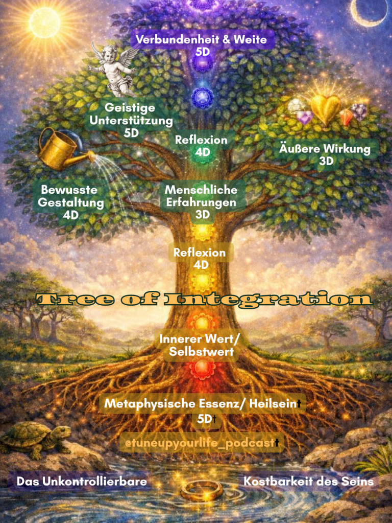 Diese Grafik habe ich entwickelt, um zu veranschaulichen, wie als Menschen energetisch aufgebaut sind und wie wir mit allem verbunden sind. Der Baum vereint verschiedene Ansätze und Lehren, daher heißt er "Tree of Integration". In Folge #10 wird er zum ersten Mal unter dem Gesichtspunkt "Selbstwert" erläutert.